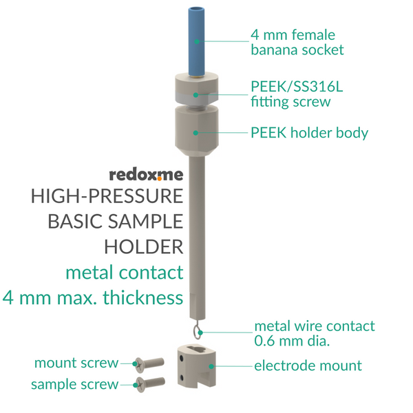 The holder is composed of PEEK body components that are in direct contact with the electrolyte, combined with a stainless steel (316L) fitting that provides mechanical strength where required. The current-collecting wire can be selected by the customer and is available in pure tantalum, stainless steel 316L, titanium, copper, or nickel. Other contact materials are available upon request. We specifically recommend tantalum wire as the electrical contact, as it is inert to nearly all organic and inorganic compounds. Tantalum exhibits corrosion resistance comparable to that of glass as both materials are unsuitable for use in hydrofluoric acid and in strong, hot alkaline environments. For such applications, we recommend selecting one of the alternative wire materials. The metal contact can be fully immersed in the electrolyte. The screws used to immobilize the sample and the sample mount are made of PEEK.